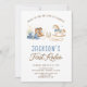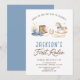 The neutral white background keeps the layout clean and elegant while the dusty blue and warm brown tones create the perfect soft western aesthetic for a girl’s first birthday party.