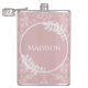Profitez de vos boissons alcoolisées préférées à tout moment avec un flacon de vinyle Damassé rose élégant. Le design flacon est doté d'un élégant arrière - plan damassé et d'espace pour ajouter votre nom orné de feuillage délicat. Autres cadeaux disponibles avec ce design aussi.
