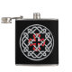 Un flacon d'alcool avec un noeud celtique avec une croix carré rouge au centre.