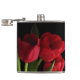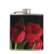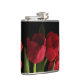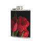 Un bouquet de fleurs rouge écarlate de tulipe et de feuilles verts mis sur un arrière - plan noir pur grace cette magnifique flacon de hanche fleurie.