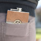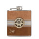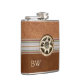 Magnifique flacon à boire inspiré de l'Europe, réalisé dans un style cuir marron clair et foncé, avec un ruban traversant le milieu. Une photographie d'un Edelweiss sculpté dans l'os décore le milieu de la face avant du flacon. Personnalisez le monogramme à deux lettres pour vous-même ou comme idée de cadeau.