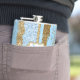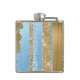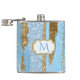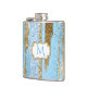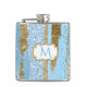 Flacon de boisson brillante, avec des graphismes d'un motif de bande verticale fait en or et bleu, la peinture et la parties scintillant look. Les images d'une plaque dorée à éclat, sur l'avant de la fiole, ont un monogramme bleu à une seule lettre prêt à être personnalisé.