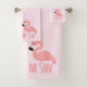 Ensemble de serviettes de bain flamingo monogrammed design. Vous pouvez customiser cette serviette de bain ensemble avec n'importe quel texte de votre choix. Si vous avez besoin d'aide pour vous customiser, contactez-nous via le lien de cette page. Ensemble de serviettes de bain monogrammed Flamant rose
