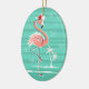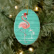 Design élégant avec une touche rétro, avec un flamant rose festif portant un chapeau de Père Noël rouge, des étoiles et des palmiers décorés de billes dressés contre un arrière - plan d'aqua rayé. Un design personnalisable pour personnaliser avec votre propre texte, images et idées. Une image d'art numérique originale créée par Quirky Chic.