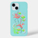 Des flamants roses vifs battent leurs ailes et frottent leurs plumes contre un arrière - plan bleu aquatique avec des roseaux et des nénuphars. Un design inspiré du milieu du siècle avec une touche rétro qui peut être personnalisée avec vos propres textes, images et idées. Une image d'art numérique originale créée par Quirky Chic.