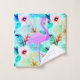 Flamingo rose vif se tenant sur une jambe sur fond de fleurs tropicales dynamiques et vibrantes et de fougères. Des vibrations florales envoûtantes.