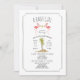 Invitation baby shower illustrant deux flamants tenant du bunting. Invitation présente également une illustration d'une île aux palmiers. Personnalisez le texte.
