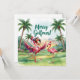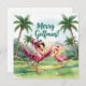 Célébrez les vacances avec une touche ludique sur le golf! Cette carte d'aquarelle présente un flamant rose vêtu comme un golfeur, portant un chapeau de Père Noël, posé sur un terrain de golf verdoyant décoré pour Noël. Les fairways sont ornés de flamants, et les lampadaires des palmiers créent une scène festive et amusante. Le texte manuscrit "Joyeux Noël" ajoute une touche joyeuse. Parfait pour les amateurs de golf, les amateurs de Floride, ou toute personne qui aime les modèles fantaisistes de vacances.