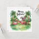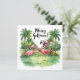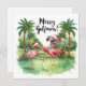 Célébrez les vacances avec une touche ludique sur le golf! Cette carte d'aquarelle présente un flamant rose vêtu comme un golfeur, portant un chapeau de Père Noël, posé sur un terrain de golf verdoyant décoré pour Noël. Les fairways sont ornés de flamants, et les lampadaires des palmiers créent une scène festive et amusante. Le texte manuscrit "Joyeux Noël" ajoute une touche joyeuse. Parfait pour les amateurs de golf, les amateurs de Floride, ou toute personne qui aime les modèles fantaisistes de vacances.