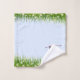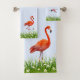 Flamant rose rose et prés avec fleurs sur un ensemble de serviettes bleu clair. Idéal pour les amateurs de nature.