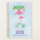 Planificateur annuel avec l'illustration d'une maman et d'un bébé flamant rose debout sur un lit de fleurs florales succulentes avec des palmiers verts se balançant dans le dos. Tropical et joli. L'arrière - plan est une aquarelle d'été bleu clair avec des touches de violet.