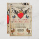 Belle et élégante invitation à la faire-part mariage inspirée du tatouage avec coeur ailé flamboyant, hirondelles bleues et bouquets avec parchemin travail sur un arrière - plan vintage grungy.