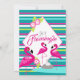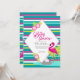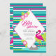 Bande graphique et flamants roses, invitations flamboyantes à la douche pour bébé. Joli flamingos rose et baby shower graphique flamand invitations en rose, blanc, bleu aqua et vert. Art graphique et design original par Sarah Trett.
