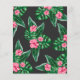 Baby shower invitation design avec flamingo rose avec frondes de feuilles de palmier vert luxuriant et fleurs d'hibiscus tropical. "Aloha Baby". Un motif à fleurs tropicales aux couleurs arrière - plans noires habille le dos de la carte.