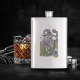 Un sorcier tout en violet tenant un bâton qui a une boule de cristal violet. Un petit dragon vert, un noeud celtique, une bougie et une bordure d'automne feuilles le tout dans un décor bleu clair