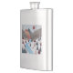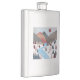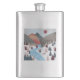 Un magnifique paysage aux textures uniques montrant un paysage de rivière et de montagne avec un renard en chasse à mi-sauts dans la neige dans les tons rouge, vert, bleu et beige.
