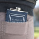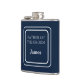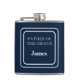 Un flasque enveloppé de vinyle est présenté dans une couleur unie de bleu marine avec un exemple de nom de père du marié.