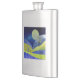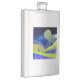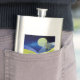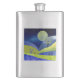 Un paysage abstrait représentant des collines ondulées avec un arbre printanier fleuri et des plantes et une lune et des étoiles dans les tons bleu, cyan, jaune et rose.