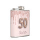 Un cadeau pour une fête de 50e anniversaire girly et glamour. Un or rose clair, arrière - plan rose avec élégante parties scintillant en or faux rose gouttes, la peinture goutte à goutte. Le texte : Le nom est écrit en or rose foncé avec un script de style manuscrit moderne. Personnalisez et ajoutez un nom. Le numéro 50 est écrit avec une police de style ballons d'or rose.