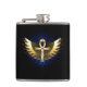 Chevalier égyptien doré aux ailes tressées et brillantes sur un arrière - plan noir. Symbole magique.