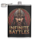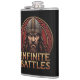 Un design audacieux et dynamique avec le texte "Batailles infinies" dans une palette de couleurs viking traditionnelles, rouge et or. Les mots sont disposés dans un style puissant et angulaire, rappelant les runes anciennes. L'arrière - plan est une surface texturée et patinée, ajoutant un sens d'authenticité et une signification historique.