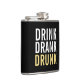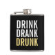 Boire Boire Boire ivre | Black and Gold Chic Funny Flask avec l'expression "Drink Drank Drunk" en gras style de police de texte. Veuillez noter que la feuille d'or affichée sur le produit est un effet imprimé, pas une feuille d'or réelle.