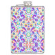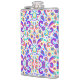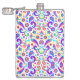 Colorful flask with a vibrant pattern of paisley, flowers, and stars in blues, pinks, and yellows on a white background, evoking a playful and retro vibe.