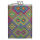 Colorful hip flask with a vibrant geometric diamond pattern in blue, yellow, green, and pink. The design creates a lively and energetic visual effect.