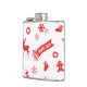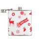 Un flacon de liqueur de Noël avec une répétition transparente et rouge des éléments de Noël - bas, gingerbreadman, flocons de neige, rennes, ornements de Noël, bougies, sapin de Noël, et les mots "Joyeux Noël" - en illustration.