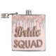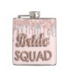 Un flacon pour un enterrement de vie de jeune fille ou une fête de mariage. Un fond rose pâle doré, avec des gouttes de paillettes rose gold élégantes et de fausses paillettes argentées, aspect peinture qui coule. Avec le texte : Bride Squad écrit avec une police de style ballon, de couleur rose gold