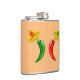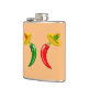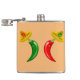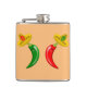 Cette magnifique flacon de hanche comprend une paire de piments, un piment rouge et un piment vert. Ils ont tous deux les yeux noirs et la bouche rose. Chaque chili porte un casquette sombrero qui a un crâne de la couleur opposée au chili sur elle pour célébrer la fête mexicaine de la mort, Dia De Los Muertos. Le sombrero contient également trois fleurs avec alternance des pétales rouges et verts représentant le drapeau du Mexique.