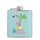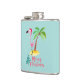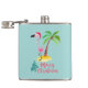 Une fiole avec une jolie illustration d'un flamant rose dans un chapeau de santa rouge. À côté d'un palmier vert sur un monticule de sable jaune. Un design d'arbre de Noël tourbillonnant est placé à côté du texte Joyeux Noël. Écrit dans la couleur rose dans une police manuscrite fantaisie. Arrière - plan vert pastel.
