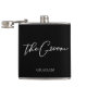 Cette élégante et simple flasque pour le marié présente le nom de votre marié sous une typographie blanche minimaliste sur fond noir. Personnalisez ce cadeau de mariage élégant et moderne pour votre mariage ou enterrement de vie de garçon.