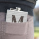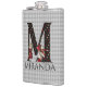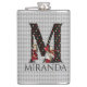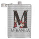 Whimsical Wonderland flask avec vintage Alice et la Reine des Coeurs personnages illustrations couleur avec grande lettre / initiale M avec une carte noire/or/rouge suites remplir motif sur un arrière - plan arlequin gris vintage. Personnaliser davantage avec du texte de nom personnalisable