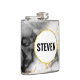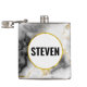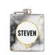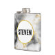 Un flacon avec une motif marbrée moderne et classe. Marbre blanc, noir et gris fumé avec de minces rubans de tourbillons en faux or dans tout le motif. Un cercle blanc avec un cadre en faux or superposé avec votre nom à l'intérieur.