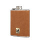 Flacon monogrammé en cuir marron simple avec un design moderne avec emblème en or métallique brossé monogramme sur cuir marron sable look arrière - plan texturé. Idéal pour les anniversaires, la remise des diplômes, la retraite, les cadeaux de toiletteurs mariages et plus encore.