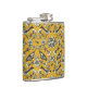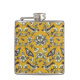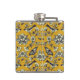 Cette fiole présente des oiseaux, des fleurs, des abeilles et des papillons en bleu marine et de la crème sur un arrière - plan jaune moutarde.