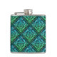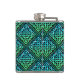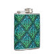 Un flacon de liqueur avec un motif de tuiles répétées d'un noeud celtique bleu-vert diamant contre un arrière - plan noir.