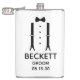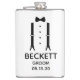 Ce flacon de 8 oz est idéal pour le marié. Si tout votre cortège de mariage portera des costumes, ce design avec des bretelles et un nœud papillon noir serait parfait. Décontracté mais élégant. C'est idéal pour un week-end de célibataire ou une soirée d'enterrement de vie de garçon. Un cadeau amusant pour un bon moment. Procurez-en un pour tout le monde dans le cortège de la mariée - ils adoreront ! Le titre peut être changé en meilleur ami, garçon d'honneur, ouvreur, etc.