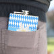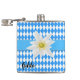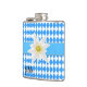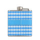 Flamme de boisson à thème Oktoberfest faite dans le motif de diamants bleu et blanc classique pour Oktoberfest, avec des graphiques d'un ruban satiné bleu à l'aspect du centre. Graphiques d'une seule fleur blanche edelweiss, décorent le front central de la fiole. Personnalisez le texte noir personnalisé, sur le devant, pour vous-même ou comme une idée de cadeau charmant pour elle.