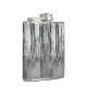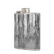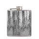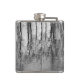Cette fiole de hanche noire, argentée, blanche et grise présente des reflets d'arbres qui font un motif abstrait chatoyant sur l'étang.