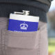Créez votre propre fiole de hanche personnalisée avec ce modèle amusant, cool et facile à customiser qui a une couronne royale en blanc contre un arrière - plan bleu marine bordé en haut et en bas avec une bande horizontale gris très clair.