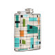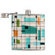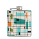 Cette grille rétro et Starbursts Vinyl Wrapped Flask est l'endroit où le style vintage rencontre le moderne. Arrière - plan de couleur crème avec kitschy, carrés de kilter et rectangles turquoises, turquoise, bleu clair, orange et vert avocat. Les blocs de couleur fantaisiques sont superposés dans certaines intersections de grille. Il y a aussi des rectangles noirs avec des lignes verticales et horizontales noires formant un motif de grille. Des créations de starburst noir et des carrés placés sporadiquement tout au long de cette tapisserie moderne de couleur du milieu du siècle. Attrapez vos bottes de départ et vos clochers et profitez de ce retour aux années 1960.
