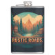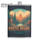Un design graphique nostalgique qui rappelle les jeux d'aventure classiques, avec le texte "Rustic Roads" dans un style vintage et pixélisé. La palette de couleurs évoque un sentiment d'aventure et d'exploration, invitant les spectateurs à se lancer dans un voyage à travers des paysages pixélisés.