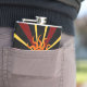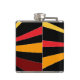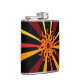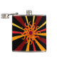 Ce flacon décoratif de hanche présente un motif géométrique abstrait sauvage du soleil et ses rayons de couleurs rouge, jaune, or, orange et marron sur un arrière - plan noir pur.