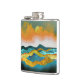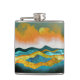 paysage Abstrait d'une vue de montagne avec des collines ondoyantes et une tempête de pluie en orange, or, bleu et cyan.