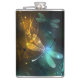 Vol de libellules brillantes, vertes, artistiquement dessinées avec des ailes vertes et jaunes transparentes sur arrière - plan de nuit brillant avec des plantes de marais et des lucioles. libellule éclatante.