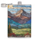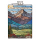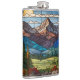 A radiant stained glass scene of a majestic forest sanctuary, where towering trees frame a stunning mountain range in the distance. Light and color intertwine to create a serene yet powerful tribute to the wild.