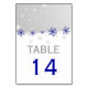 Bleu, gris argenté, blanc flocon de neige moderne mariage numéro de table carte de place, avec étoiles et élégantes flocons bleus sur gris. Texte en bleu et gris. Un design élégant parfait pour vos mariages d'hiver, de décembre ou de Noël. Pliez-le le long de la ligne pointillée pour avoir une carte de place pliée style tente.