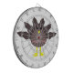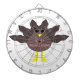Cette superbe planche de fléchettes présente un dessin d'une dinde aux grands yeux noirs, un petit bec jaune et des plumes de queue qui collent. Les pieds sont orientés dans des directions opposées, ce qui rend la dinde un air de nid. La dinde a du texte rose sur son ventre qui dit "Bon thanksgiving" et on dirait que les plumes ont été arrachées pour révéler le message.